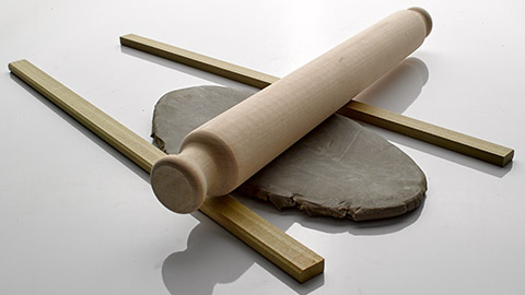Roll the clay slab flat using rolling guides to ensure a uniform thickness. Take care when rolling out and turning the clay, and avoid lifting the clay at the edges to prevent curling. To stop the clay from sticking to the table top, roll it out on top of a cloth.