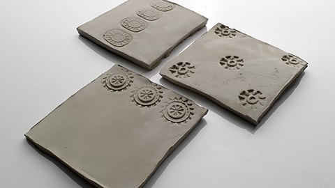 With a pottery knife, trim your clay slab to a 15cm-by-15cm square, using the rolling guides as a straight edge. Now add texture to your tile! Marks can be made in the clay using a variety of tools, including wooden stamps.