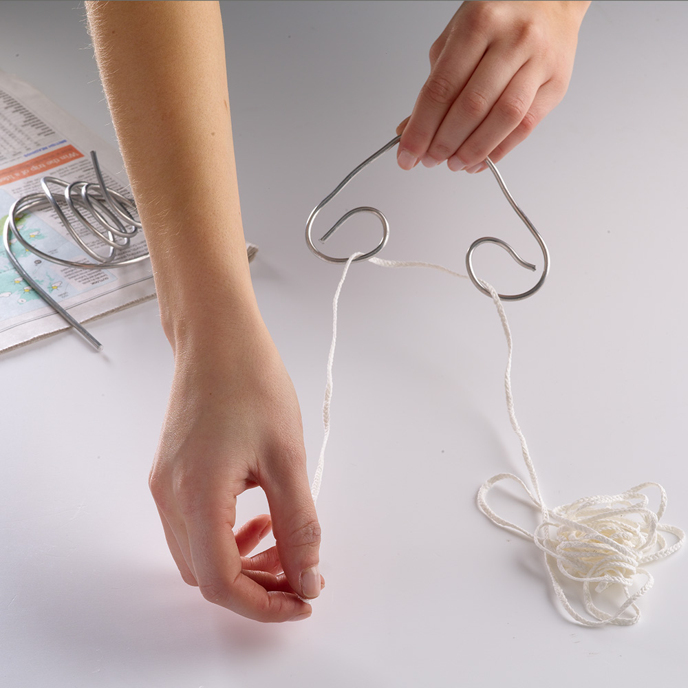 2. Thread the wicking through the hole in the bottom of the mould and tie a secure knot. If you find it difficult to get the wick through the hole because of fraying for example, try dipping it in some wax and rolling it to a point so it can be poked through more easily.