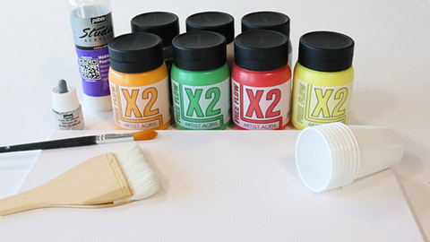 Prepare your workspace, this could get messy! You will need a range of X2 shades, plastic cups, a hake brush or similar, a pouring medium and silicone oil. *Drying times may vary, factor in 3-4 days for this project.*