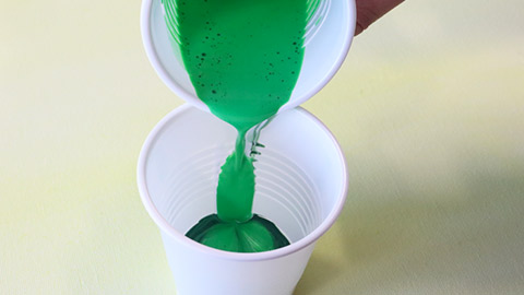 Mix approximately 1 part X2 acryl paint, 0.5 part pouring medium and 0.5 part water to create fluid paint with the consistency of warm honey. Stir in a few drops of silicone into each colour, and then pour a part of each colour into one cup