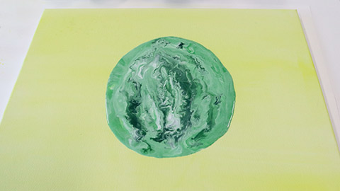 Once this is prepared, slowly pour the paint out onto the centre of your canvas. You can spread this bigger by slowly tilting the canvas in a circular motion.