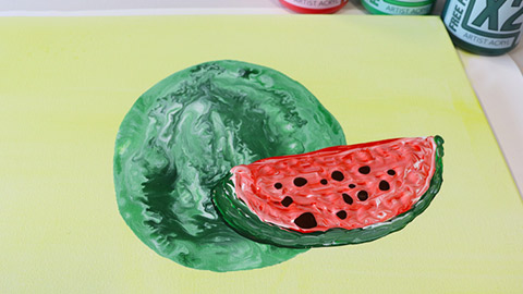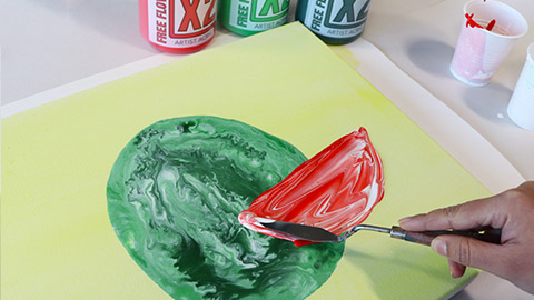 When your first layer is dry, you can add another layer over the top. Prepare paint to be poured out into plastic cups, then slowly pour this out on top of the melon. Here we have used red and white to create the centre of the melon, then used a palette knife to blend these to create a marbled effect.