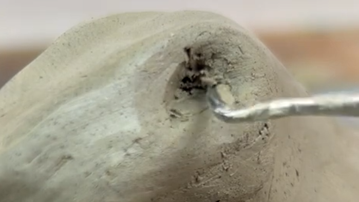 Once the clay has stiffened but is still workable, cut the sculpture carefully down the middle. Gently separate the two halves and remove the paper core. Scrape away excess clay from the inside to further reduce weight.