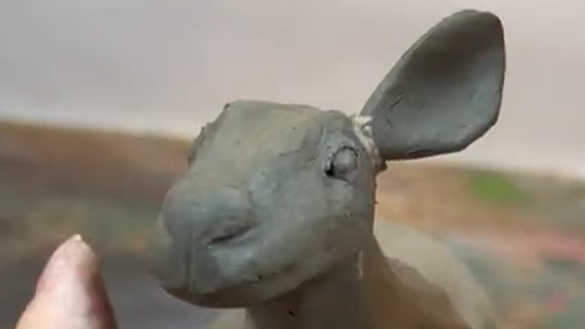 Sculpt the ears separately and attach them using clay slip as a bonding agent. Press firmly at the base, as deer ears attach strongly to the skull. Check symmetry carefully, adjusting or reattaching if necessary. Once secure, refine the ear shapes and edges.