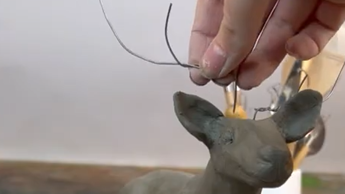 Wrap clay around the wire armature, building up the form gradually. Refine the shape as you go, smoothing the surface with water if needed. Remove the antlers temporarily if necessary to clean up the shape before reattaching them securely.