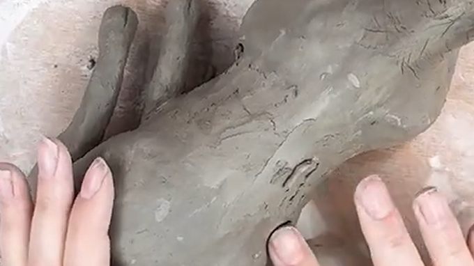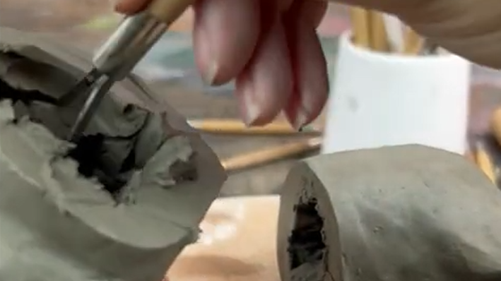 Join the two halves back together using clay slip. Press and smooth the seam firmly with your fingers, adding extra clay if needed to strengthen the join. This is crucial to prevent the sculpture splitting during firing.