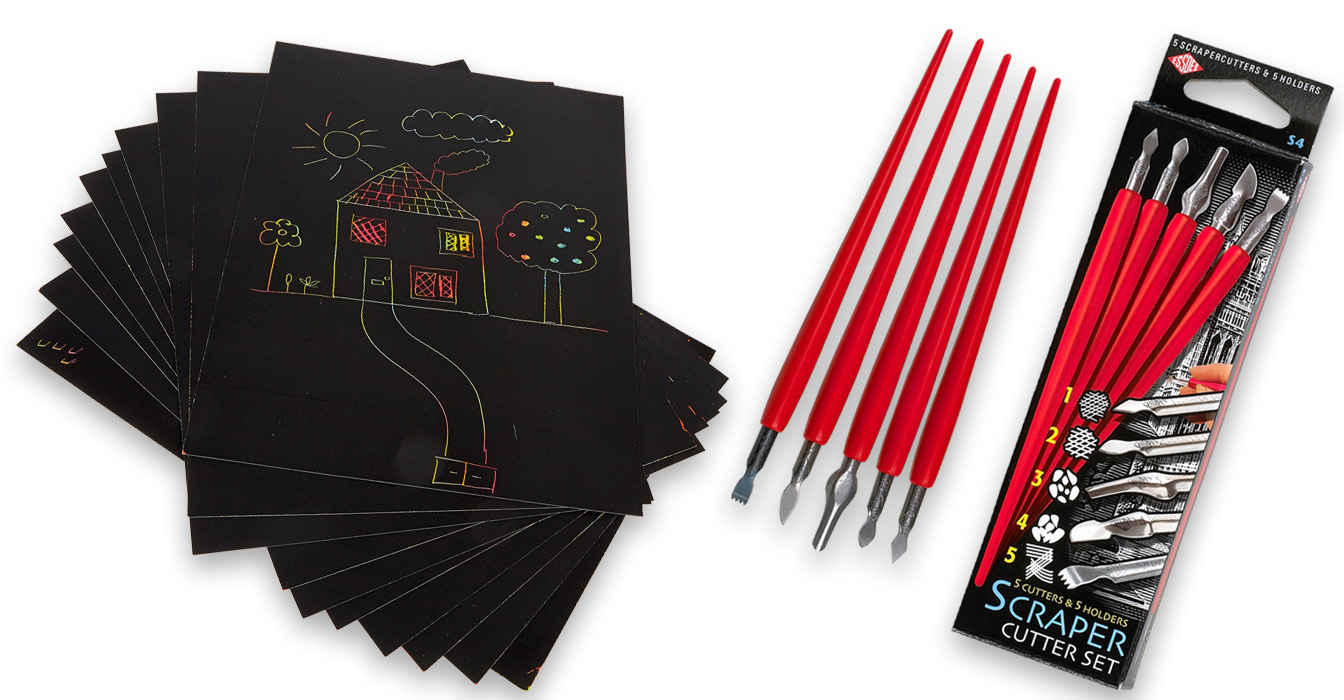 Practise cutting with the tools until they are comfortable in the hand and various scrapes can be made without physical discomfort. Get into the habit of keeping a small piece of scraperboard as a trial board.