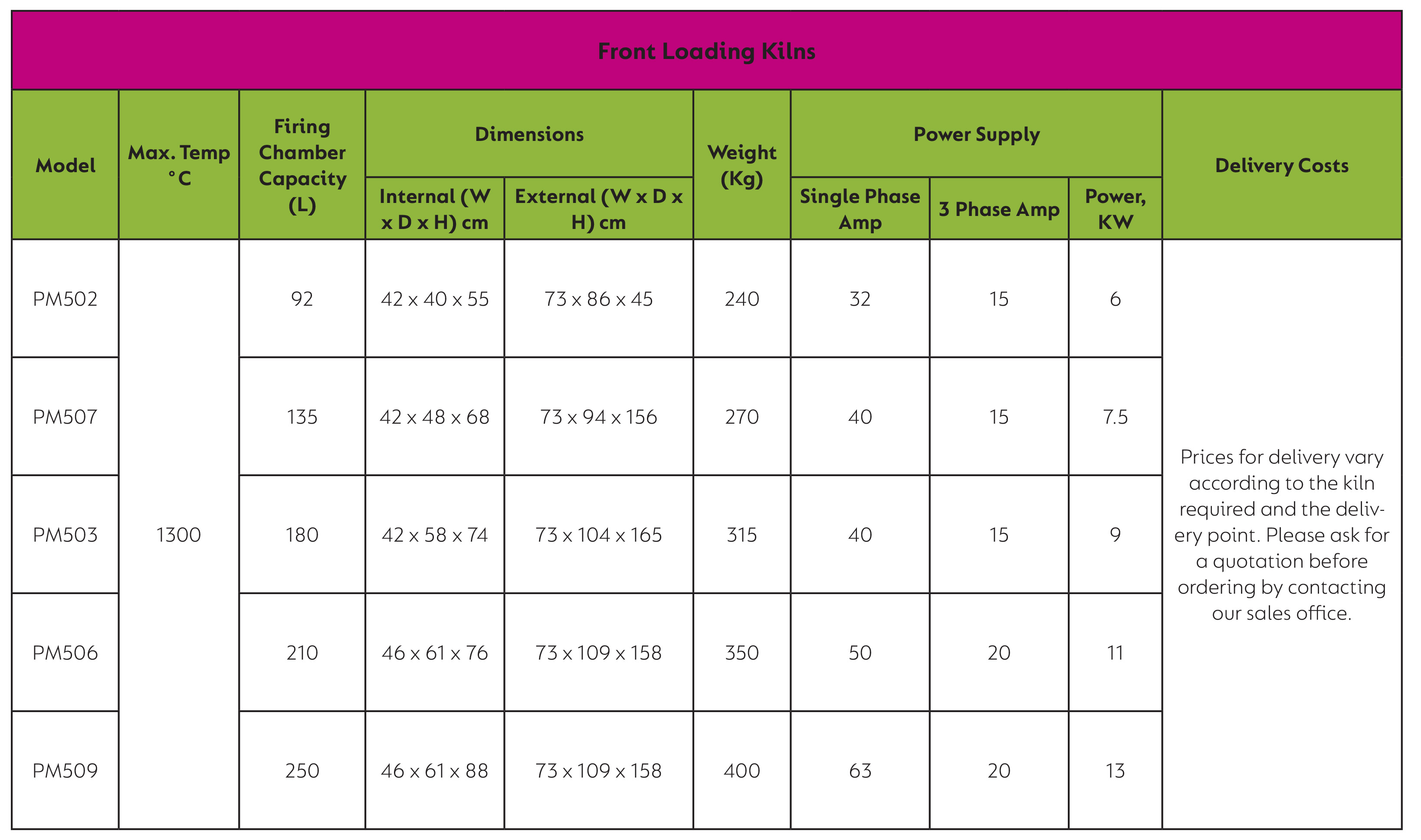 Front loading kilns are supplied with a 10 program controller; top loading kilns are supplied with either a 2 program 9 segment controller (PM725 only) or 9 program controller. Both allow you to program your own firings but the 10 program controller arrives pre-programmed. Each kiln comes with one set of kiln furniture. Kiln cages can be ordered upon request.