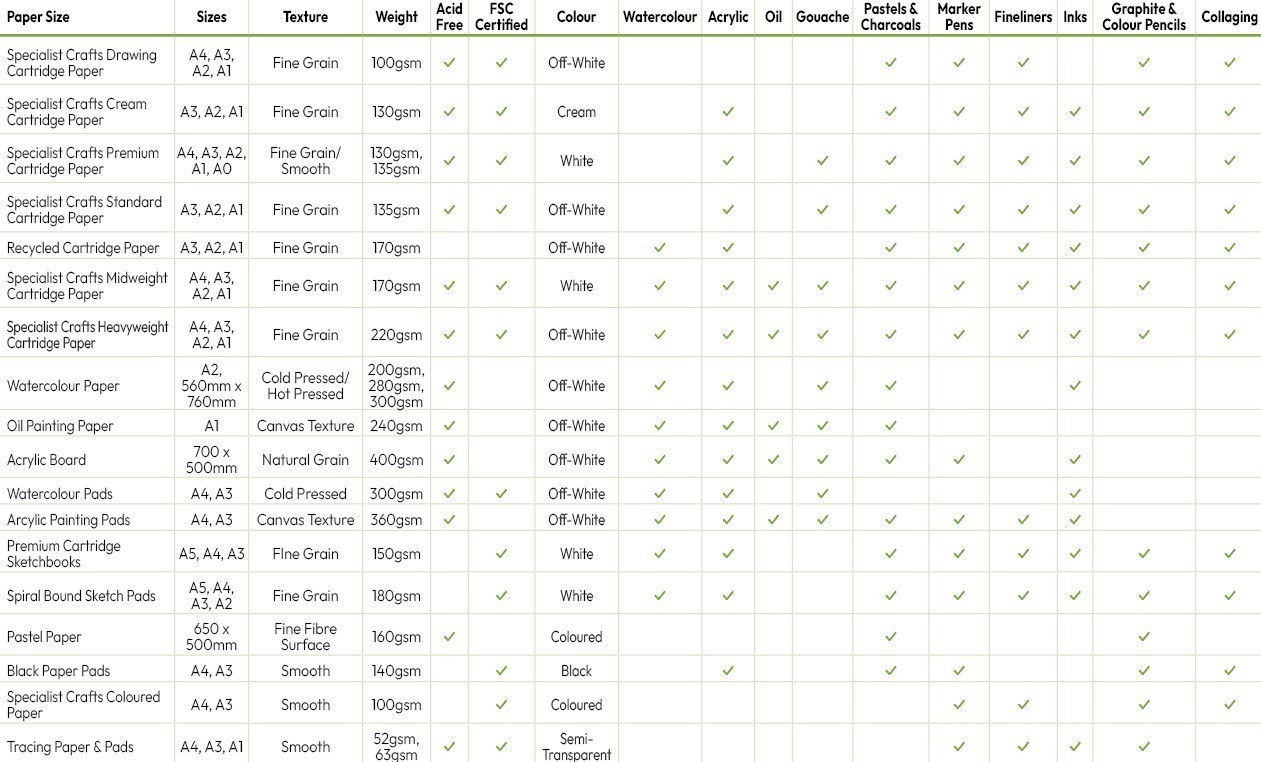 Cartridge paper is one of the most commonly used papers in schools today. Its plain, smooth sufrace makes it ideal for designing and sketching with pencils, pens and inks. We strive to offer a range of sizes in a variety of weights. All are good qualty and excellent value. Use our chart below to see the range at a glance