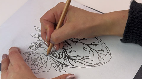 Start by drawing your anatomical heart on paper. Keep in mind that shadows and highlights will be represented through cuts - in this case darker areas will be cut, while lighter areas will remain.