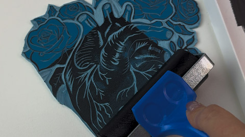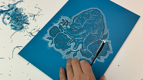 If needed, carve away additional areas for contrast and refinement. Once happy, ink the block and press onto high quality print paper for the final piece. Allow the print to dry thoroughly before handling.