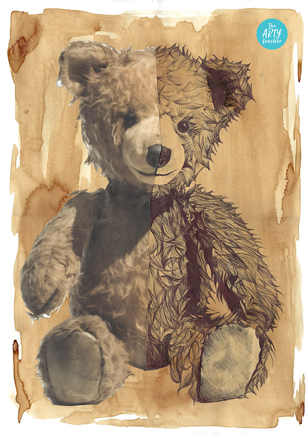 Teaching texture is highly effective here because students are encouraged to study and replicate a familiar, tactile object in detail. Soft toys, with their variety of fabrics, fur, and stitched features, provide rich visual information and allow students to practise observational skills. Using a personal object adds motivation and emotional connection, while the structured process of photographing, cutting, and assembling the image reduces pressure and helps students focus on rendering just one half of the toy with accuracy. This gives them time to refine mark-making techniques, especially the controlled line work needed to create realistic fur effects with a ballpoint pen.