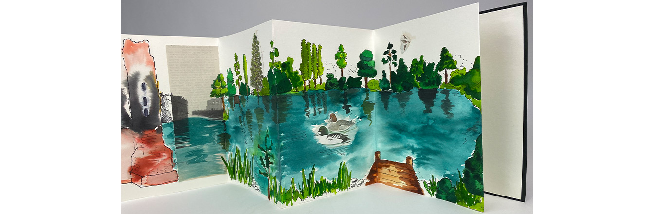Here, the concertina structure isn’t just a binding choice, it becomes part of how the story is experienced, allowing images to flow seamlessly from one scene to the next in a physical, unfolding journey.
