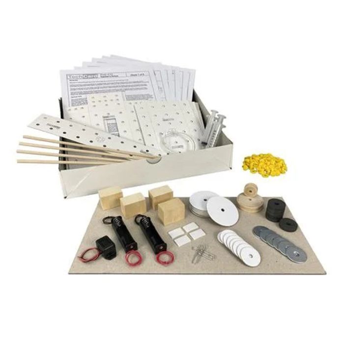 The TechCard Science Lab contains all the parts needed to build nine working models that demonstrate five key topics in the KS1 & KS2 Science Curriculum. The topics explored include, simple structures, levers and forces, magnetism, simple machines and simple circuits. There are two ways to use the Lab. The models can be assembled and used to explore topics as they are encountered in the curriculum or the models can be assembled and explored by the class as the basis of a 'science day'. The models include: Test Bench: explore shaping materials to make strong structures. Lever: demonstrate how the power and direction of a force can be changed. Floating Magnet, Magnetic Car, Magnetic Pendulum: explore the invisible force of magnetism, its origins and uses. Gravity Car, Pulley System, Pneumatic Jaw: investigate different types of simple machine and how they make work easier. Electric Buzzer: show a simple circuit in action and demonstrate that electricity needs to flow in a circuit to power things. The kit includes 100+ parts and is complete with teachers notes and assembly instructions. There are additional online resources offering further support material and web links.